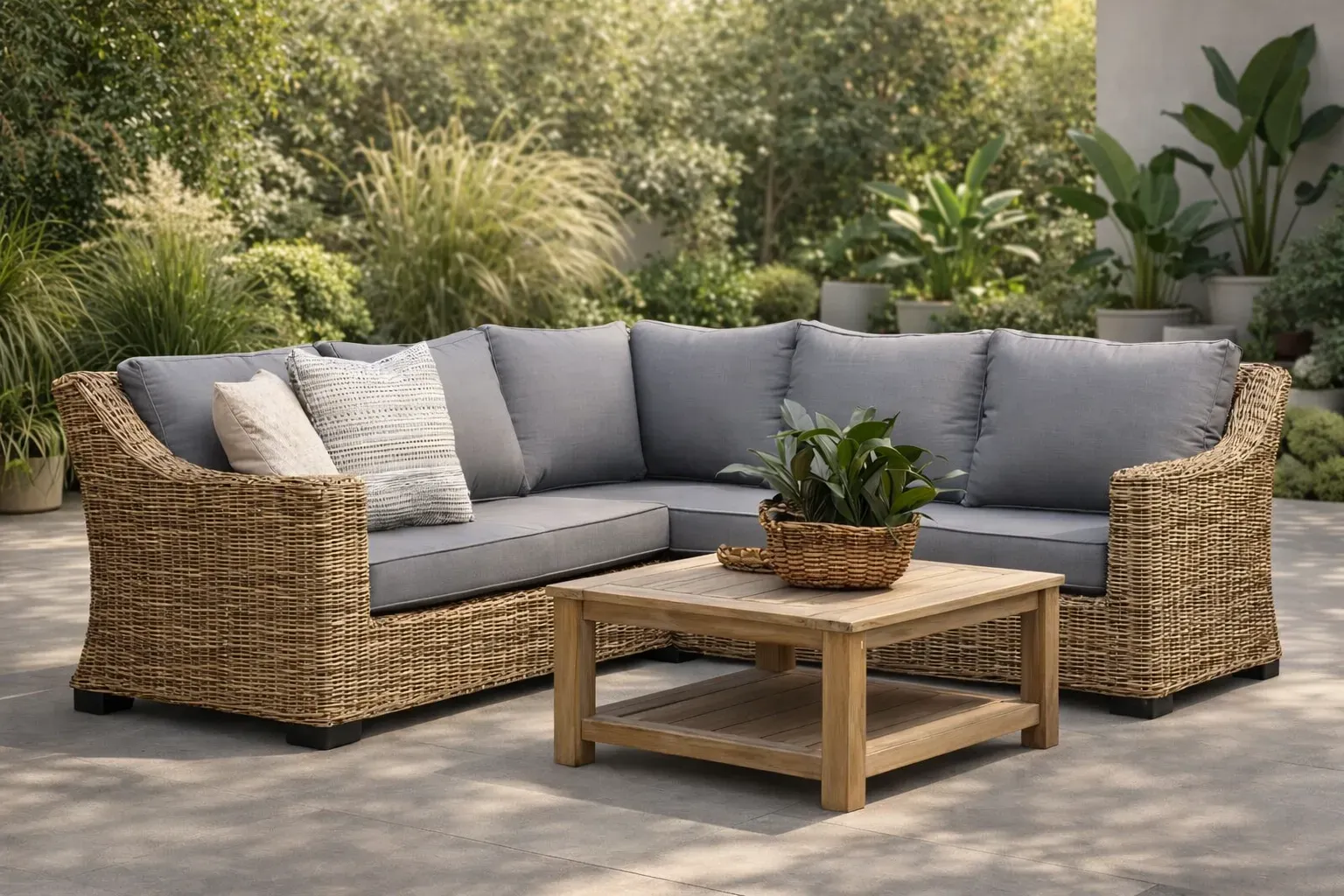 Set divano angolare in rattan con tavolino - divano 230x85x78cm - naturale/grigio - per esterno - stile naturale
